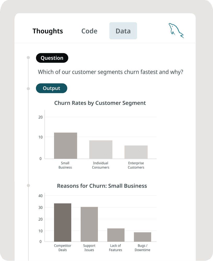 The result: a fully conversational interface for MySQL that gets accurate answers to users' questions from all domains. Your teams can ask questions in plain English, get optimized plans and SQL queries are automatically run to receive answers you can trust — all while maintaining full visibility into how the AI arrived at the result.