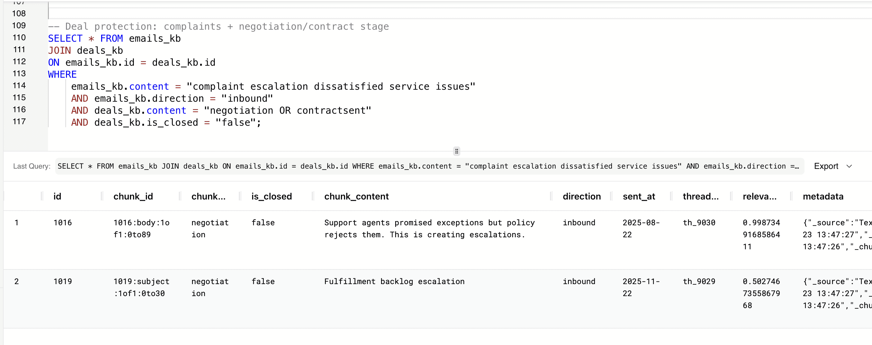 -- Deal protection: complaints + negotiation/contract stage SELECT * FROM emails_kb JOIN deals_kb ON emails_kb.id = deals_kb.id WHERE emails_kb.content = "complaint escalation dissatisfied service issues" AND emails_kb.direction = "inbound" AND deals_kb.content = "negotiation OR contractsent" AND deals_kb.is_closed = "false";