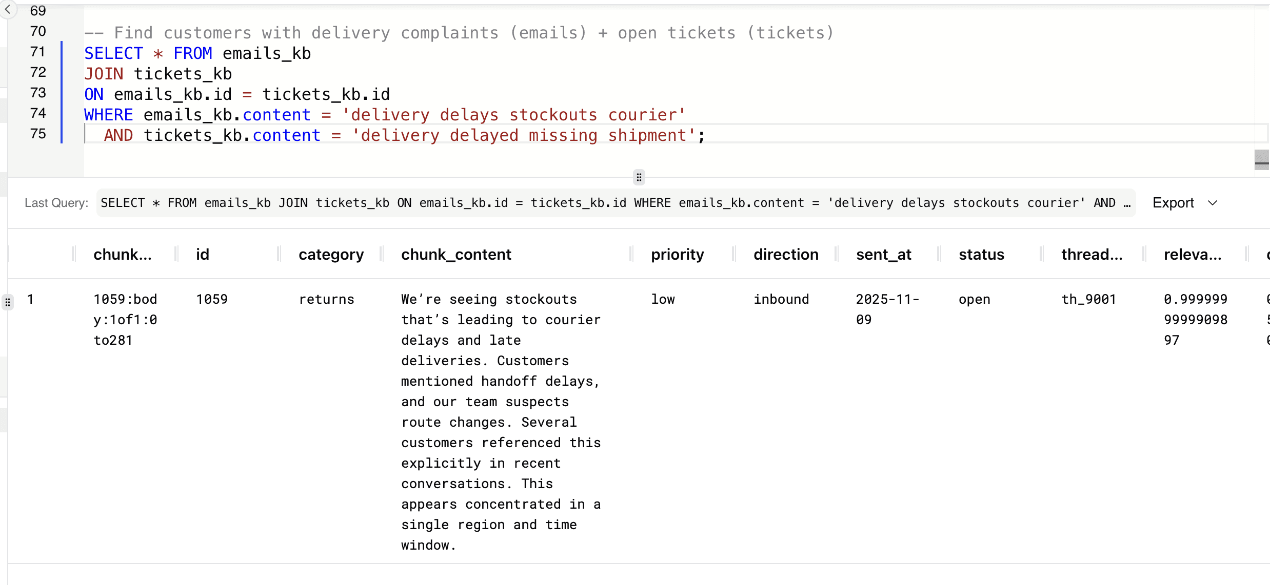 -- Find customers with delivery complaints (emails) + open tickets (tickets) SELECT * FROM emails_kb JOIN tickets_kb ON emails_kb.id = tickets_kb.id WHERE emails_kb.content = 'delivery delays stockouts courier' AND tickets_kb.content = 'delivery delayed missing shipment';