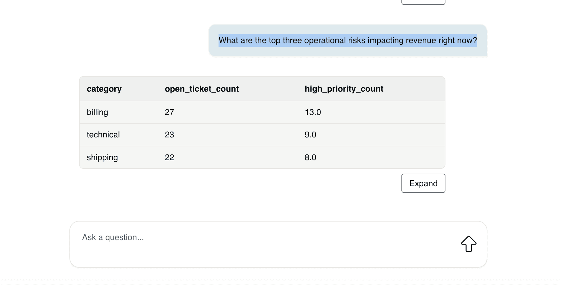 Teams need to move from siloed reporting to unified, explainable intelligence - where customer sentiment, support history, and deal context can be analyzed together without waiting for exports, pipelines, or dashboard refreshes.