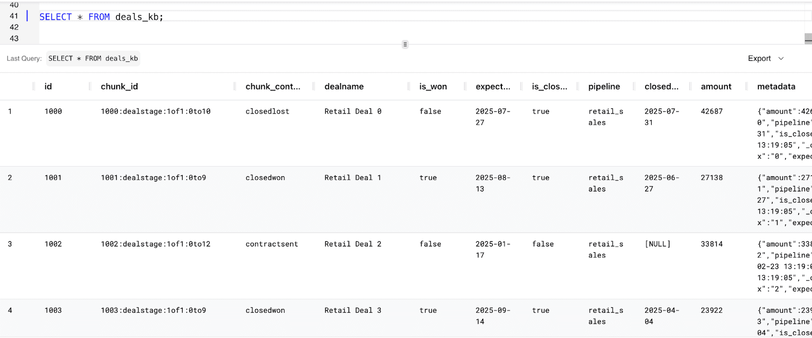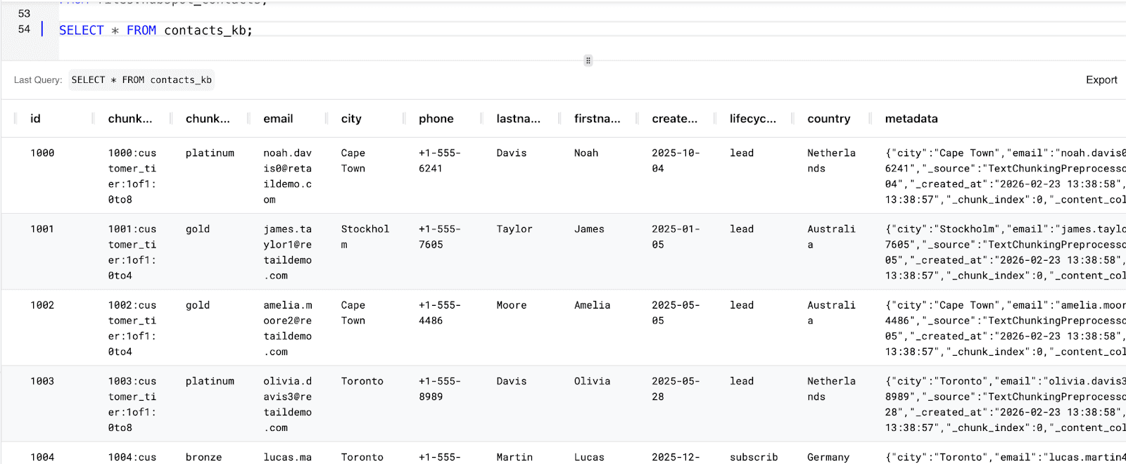 Now you can apply Hybrid Search to our HubSpot Knowledge Bases to analyze customer conversations, support tickets, and deal records together. By combining semantic search with structured CRM data, we’ll uncover meaningful patterns - such as complaints tied to revenue risk or expansion intent - using simple SQL queries.