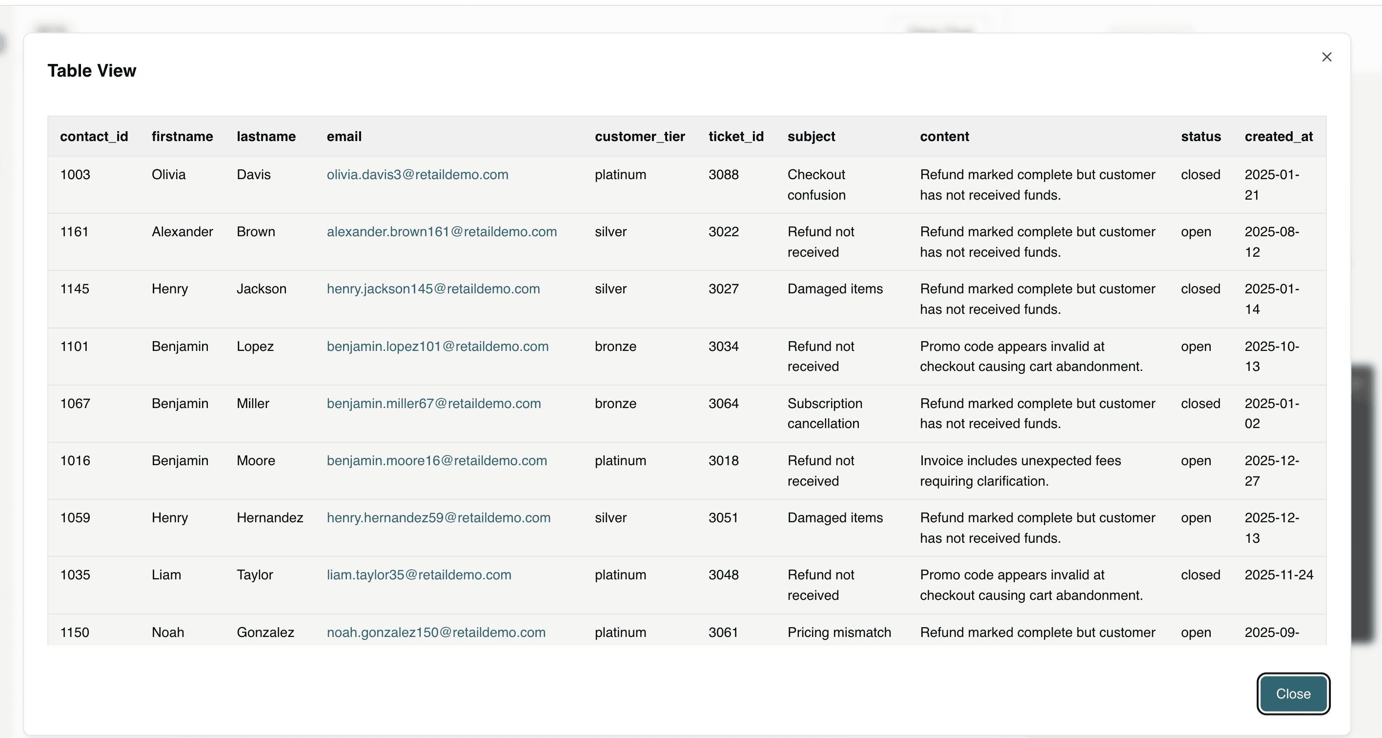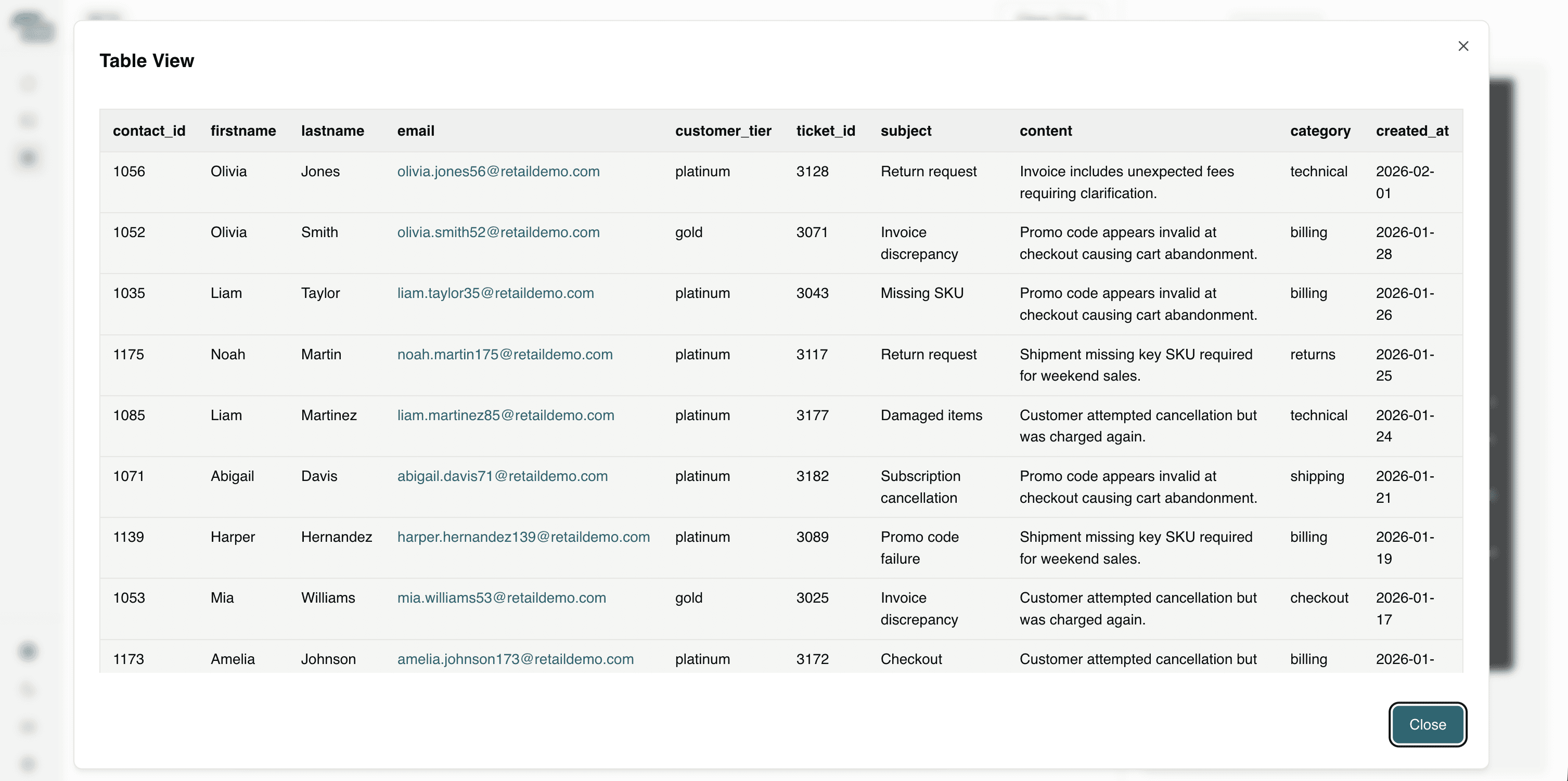 Let’s combine semantic search across two different operational datasets - emails and tickets - to identify customers experiencing the same operational issue across multiple touchpoints.