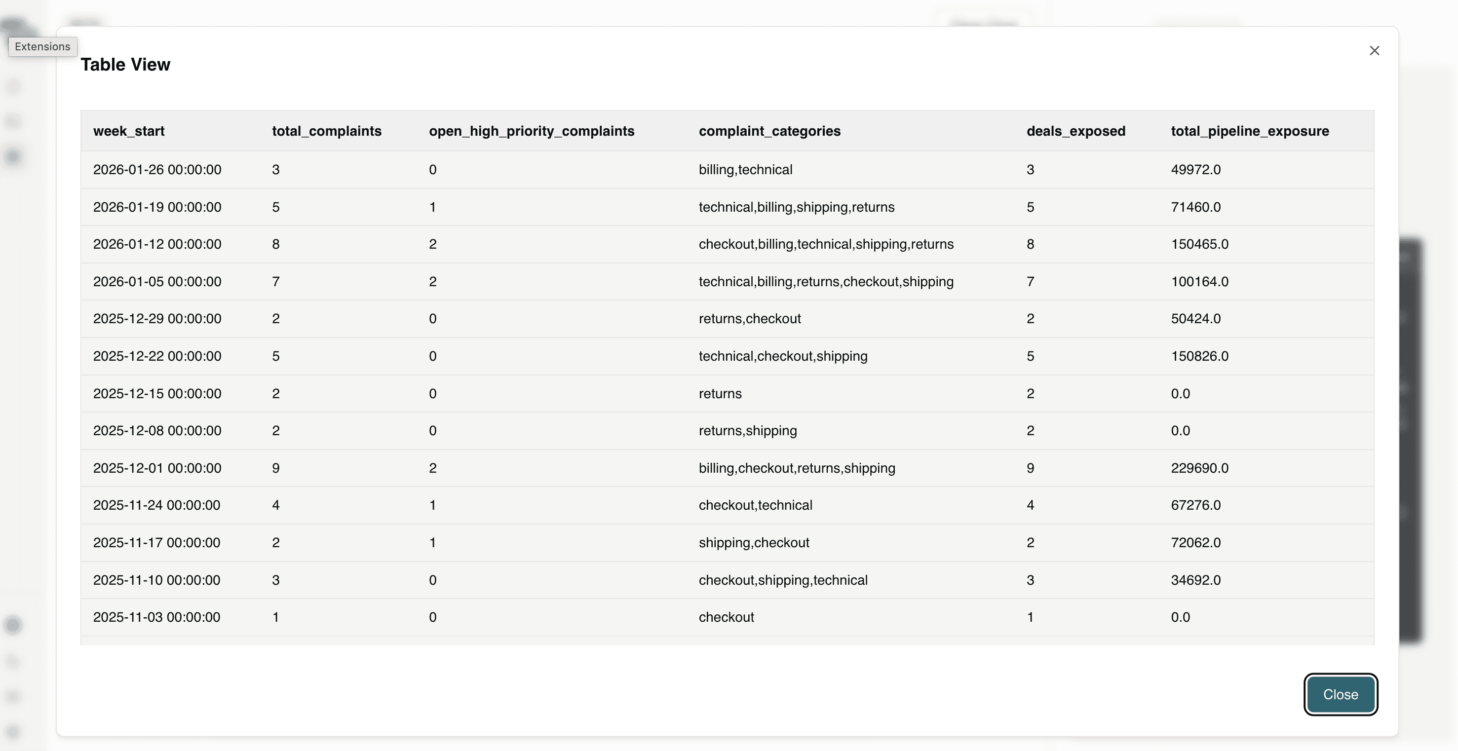 Question 8: Give me a weekly executive summary of customer complaints and pipeline exposure.