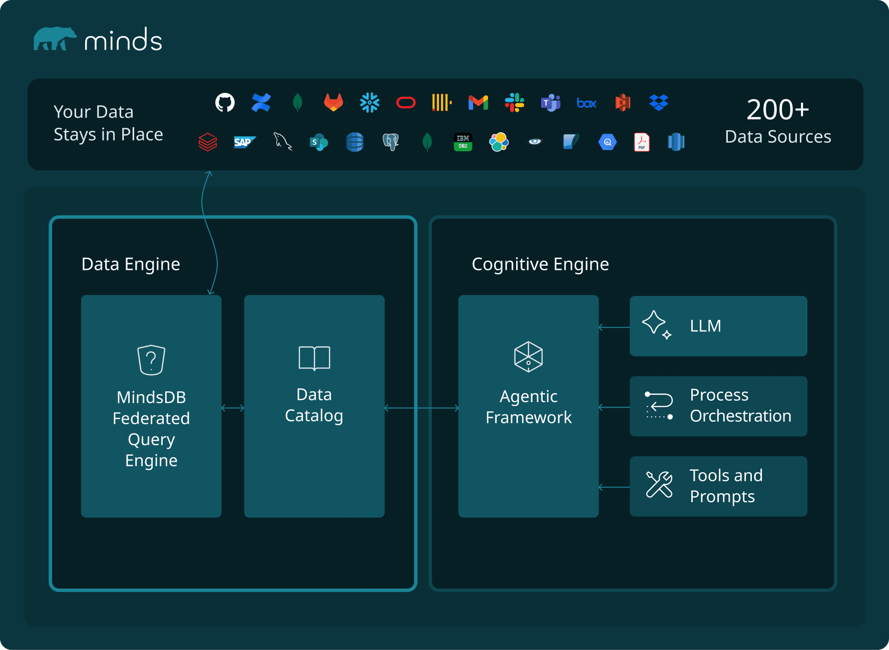 The Babel problem. OpenAI had to build custom integrations for their internal data systems. Every company that tries to replicate Kepler will face the same integration tax, and most will abandon the project when they realize the plumbing alone takes longer than the AI part. Minds connects to over 200 data sources natively: Databases, SaaS applications, file systems… Structured, unstructured, the kind of data that defies categorization. No data movement. No ETL pipelines. Your data stays where it is, and Minds federates across all of it. That's not a feature list — it's the difference between a project that ships and one that dies in integration hell.