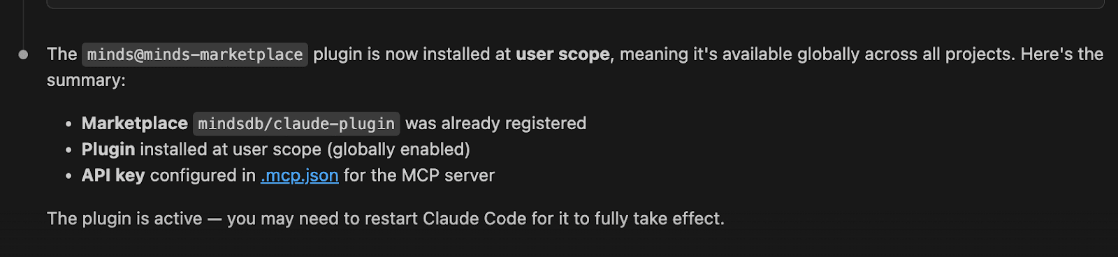 This tells Claude about the Minds plugin marketplace hosted at mindsdb/claude-plugin. If you are working on a project and want this marketplace auto-discovered for everyone, add .claude/settings.json to your repository.