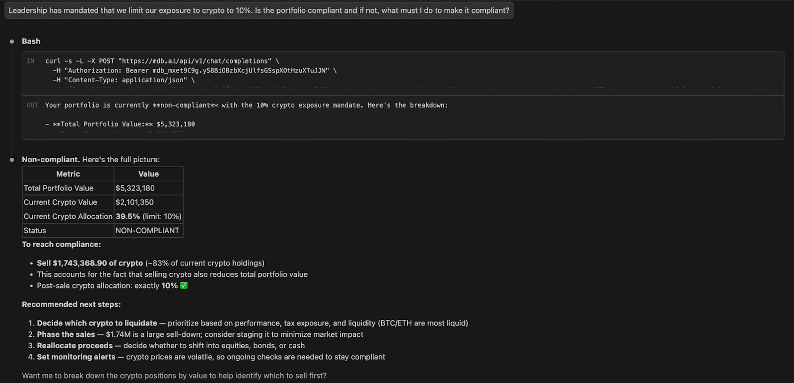 Question 4: Leadership has mandated that we limit our exposure to crypto to 10%. Is the portfolio compliant and if not, what must I do to make it compliant?
