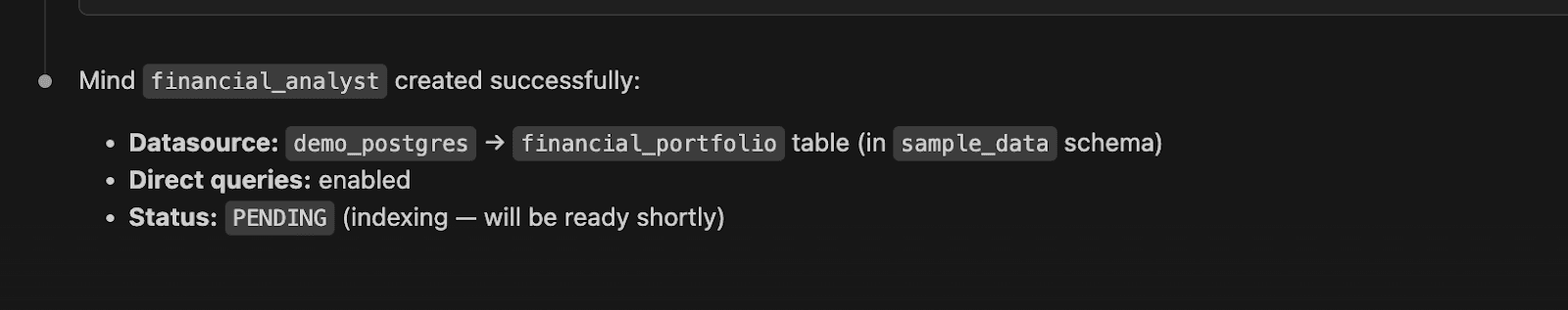 Now you can create a Mind. Create a finance analyst agent that will help you query financial data in the demo_postgres database.