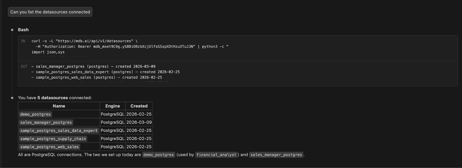 If you are connected to this datasource already, Claude will advise the following:
