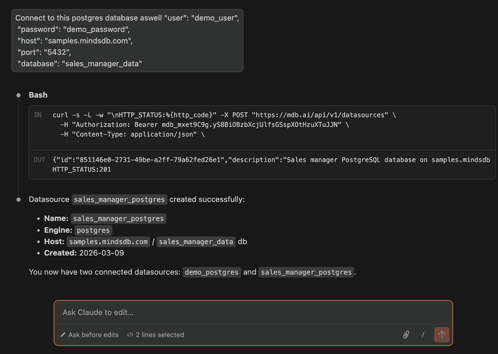 Now that the plugin is installed and connected, the next step is to create a Mind and start interacting with it from Claude Code. A Mind acts as your conversational analyst, translating natural language questions into SQL queries that retrieve insights from your connected data sources. Once created, you can begin asking questions directly in Claude Code and explore your data step by step through conversation.