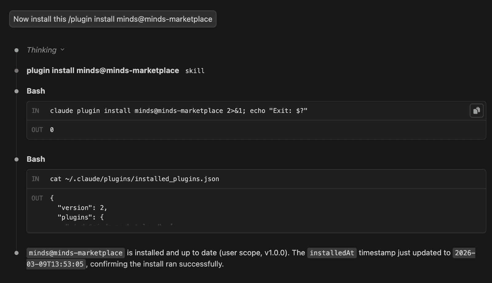 Now you can install the Minds Plugin from the Marketplace. Still in Claude Code, run: