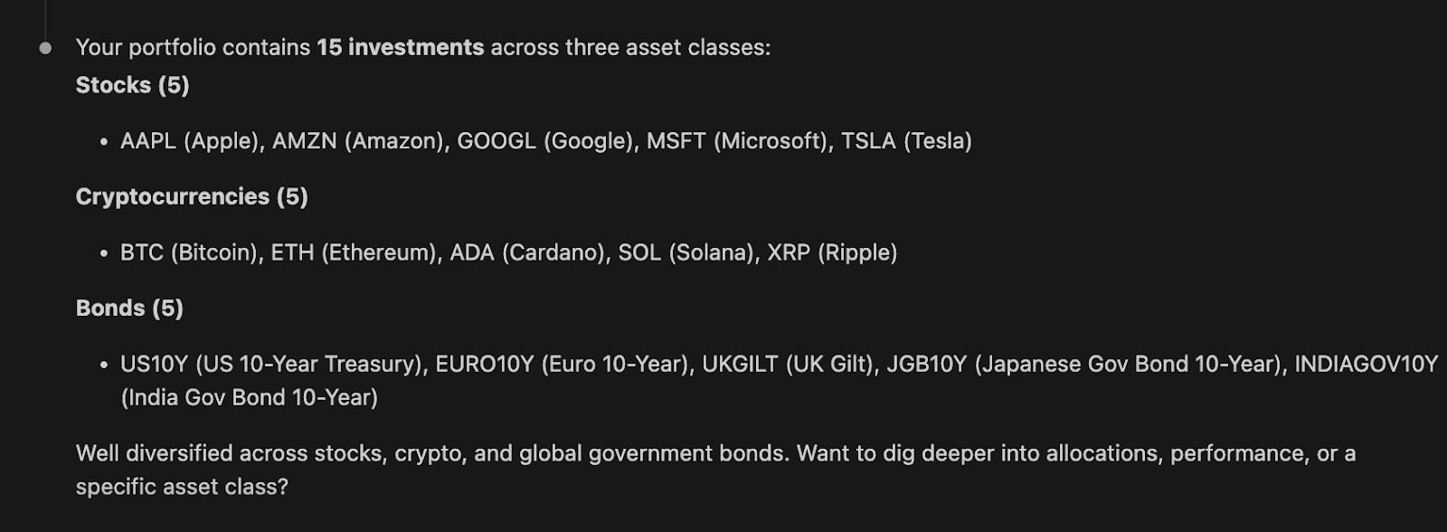 Question 2: What's the percentage breakdown of investments by category in the portfolio?