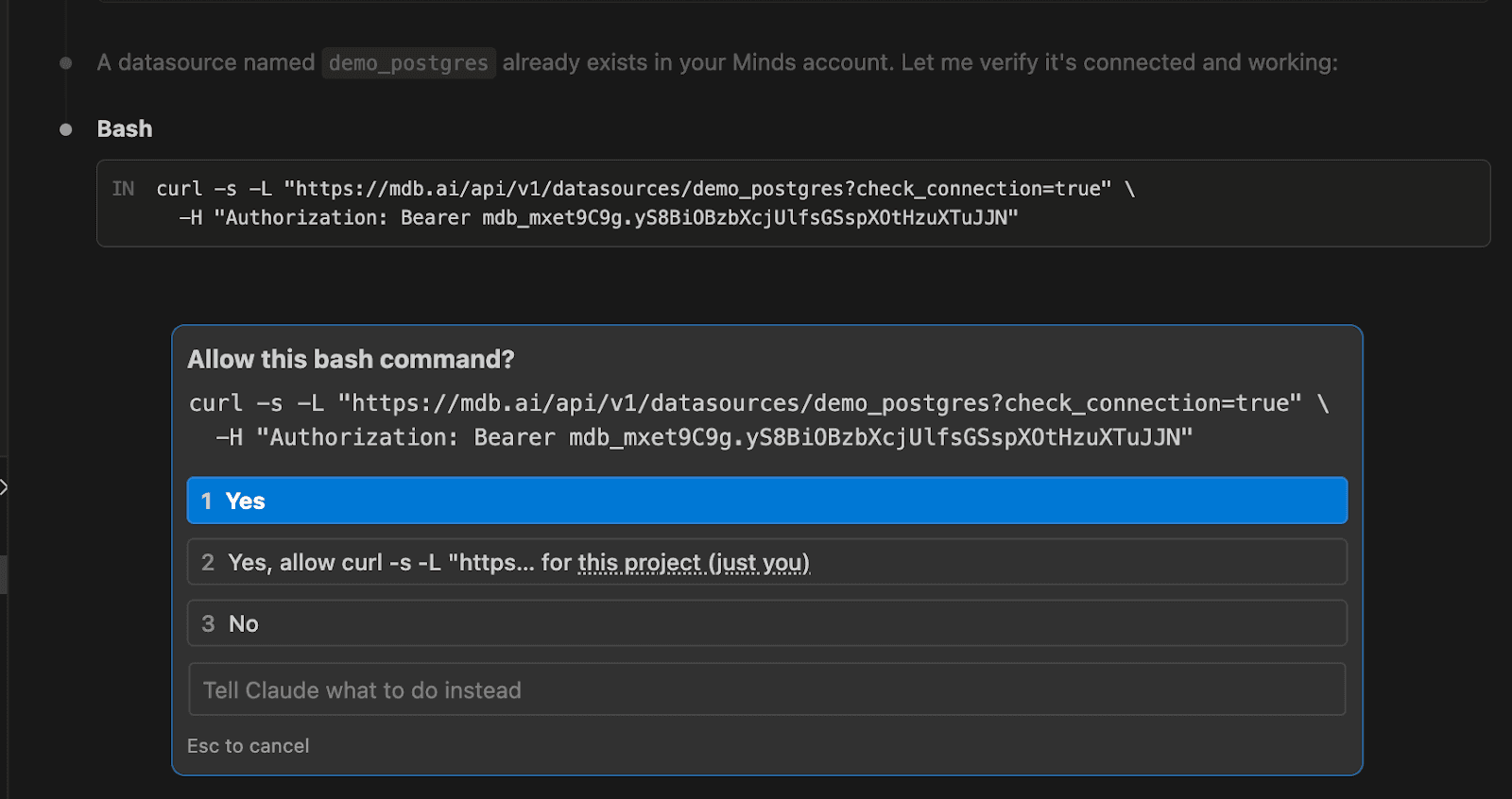 A great tip is that you can actually provide Claude code your Minds API key and advise it to set it up in your environment and it will do the work for you.