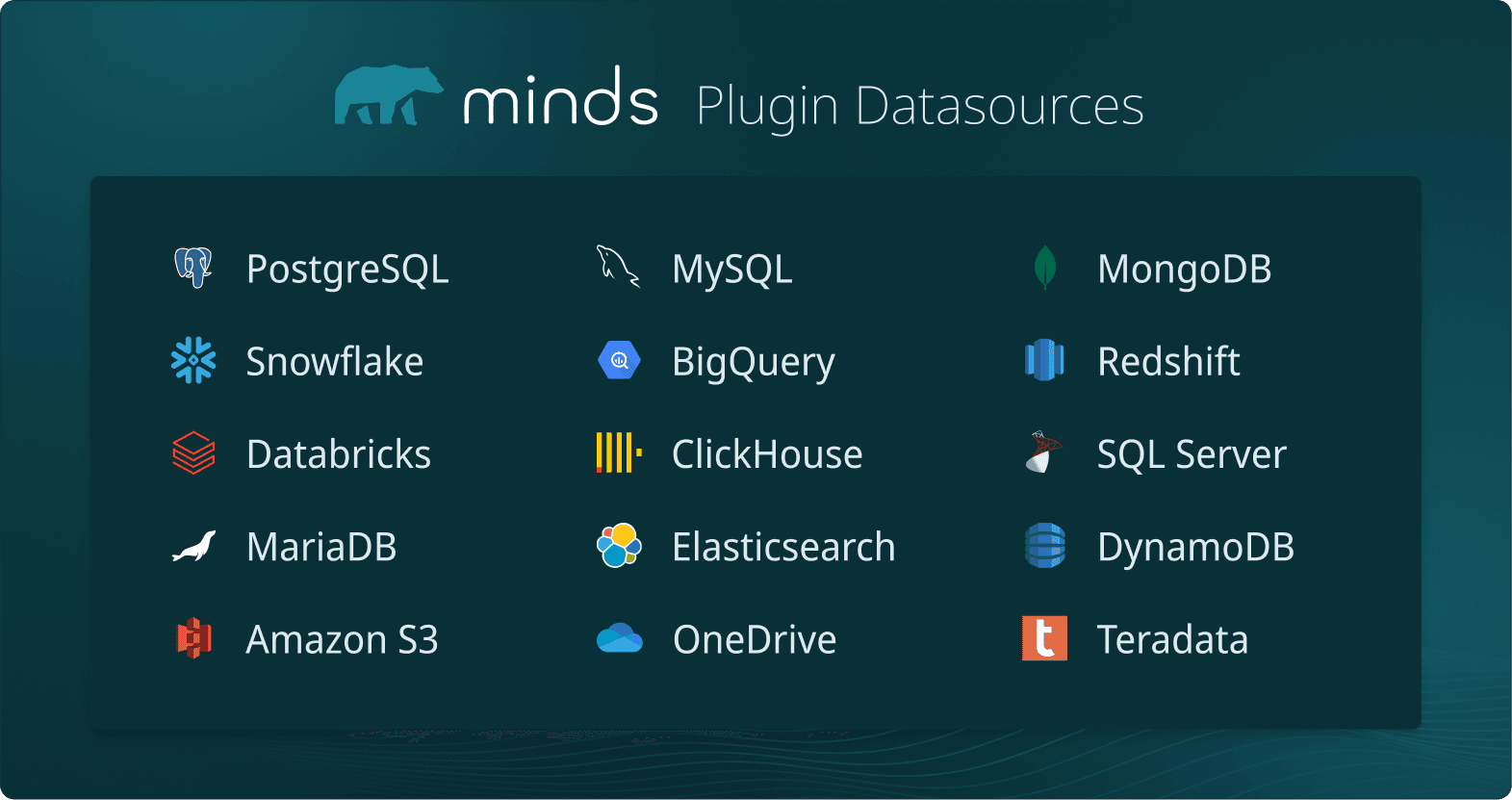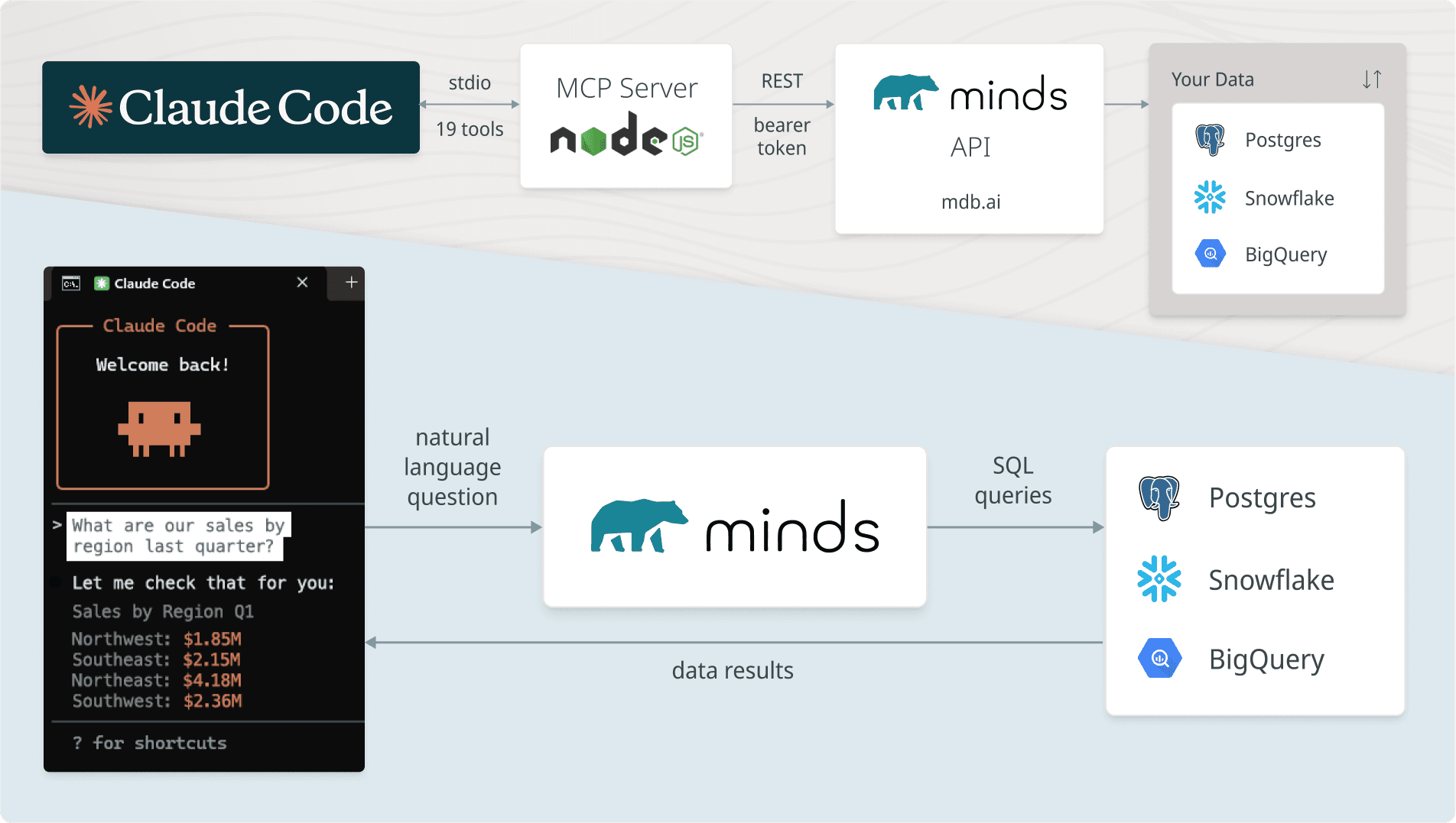 Instead of creating separate MCP servers for each database, Minds connects to multiple systems like Postgres, Snowflake, and BigQuery. Claude can query all of them through a single plugin.