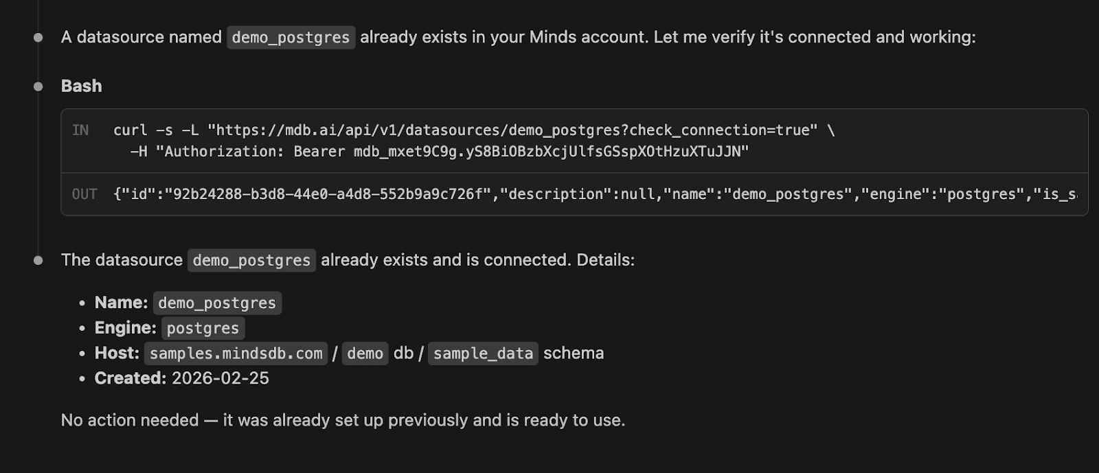 Importantly, the MCP server acts only as a thin REST wrapper. It does not store state or cache data. Every request goes directly through Minds to your underlying databases, ensuring responses reflect the latest information available.