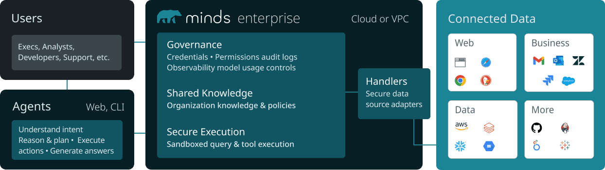 Production-ready infrastructure for agentic analytics: credential isolation, governance, cost controls and auditable analytics that embed Minds' autonomous analysis engine.