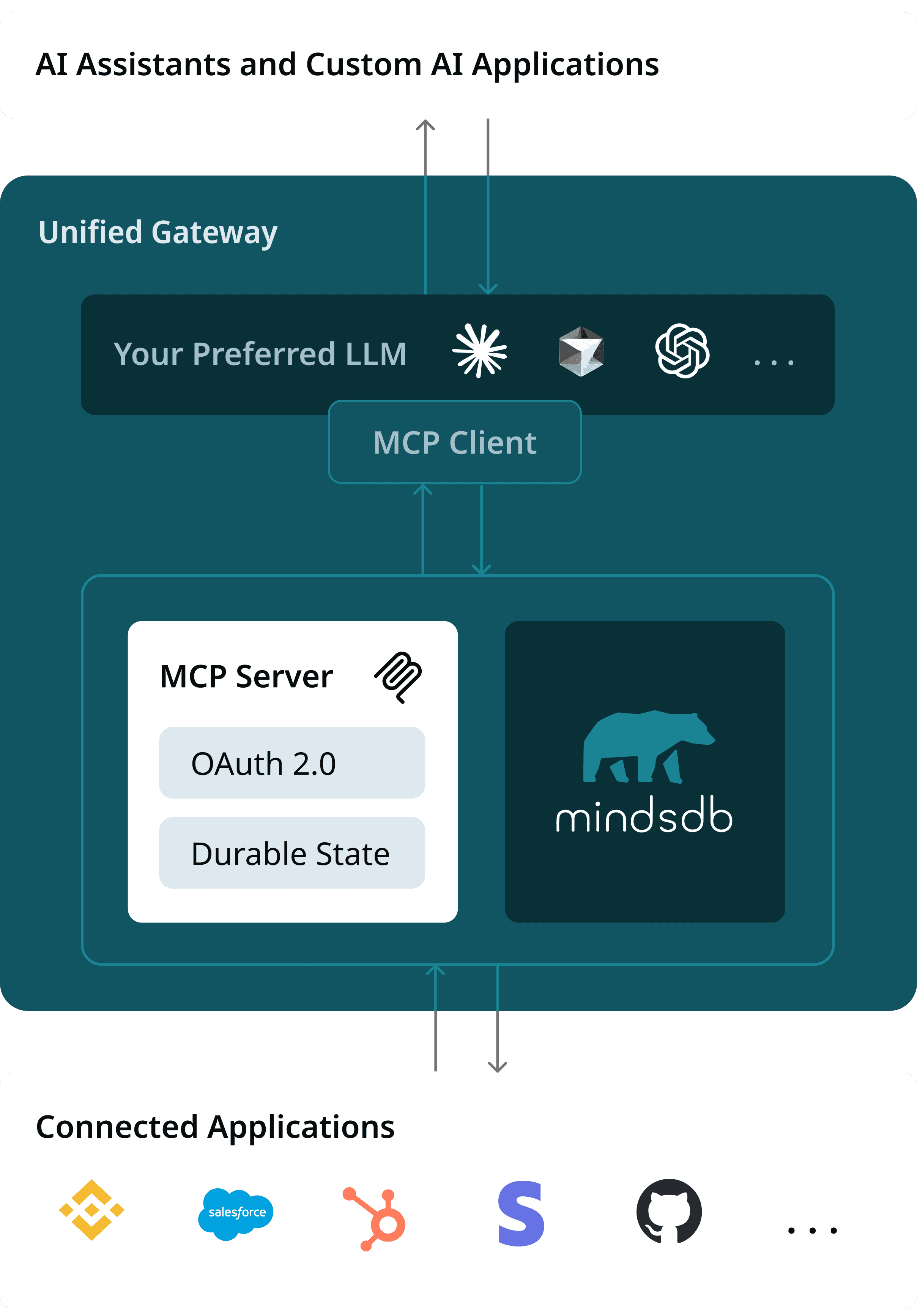 MindsDB’s Model Context Protocol (MCP) server seamlessly integrates your AI applications with popular business tools such as Salesforce, Zendesk, HubSpot, and Stripe. Through a unified gateway, MindsDB enables your AI workflows to efficiently retrieve data from multiple applications without data duplication or extensive data engineering.